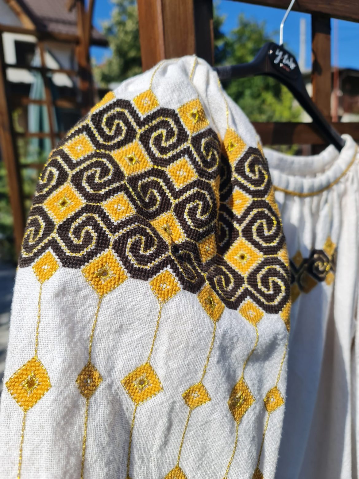 Astfel, bluza asta nu mai rămâne o simplă haină. Ea devine o armură invizibilă, o legătură între cer și pământ. Spiralele apără, romburile aduc rod, iar albul pânzei – curățenie și adevăr. Când o îmbrăcă, domnița (la a doua tinerețe) simte că duce pe umeri nu doar frumusețea cusutului, ci și binecuvântările străbunilor.