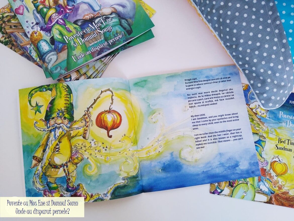 De unde atâta inspirație, după zile (și nopți) de crescut copii mici? Am găsit clenciul cu subiectul despre Moș Ene și Domnul Somn pe care, precum o placă, le-am spus-o de mai multe ori. După o vreme însă, am început să primesc recamații la orice modificare de text (de la cel mare care avea 4 ani). Salvarea mea a fost scrisul. Am scris-o. Am și înregistrat-o, ca să evit citațiile de neconformitate la care deja nu mai făceam față. Ba chiar am tradus-o și în engleză, ca să încurajez bilingvirtutea.
